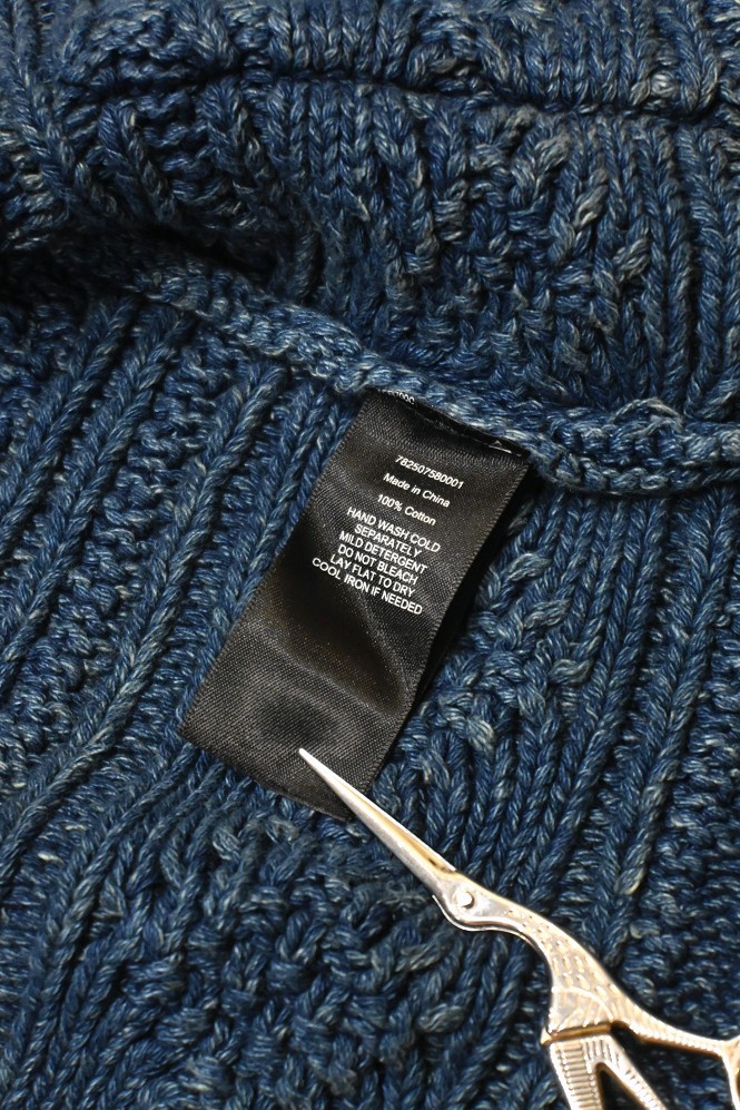本藍染め(インディゴ染め)のケーブル編みカーディガンにビンテージウォッシュ加工を施し、
