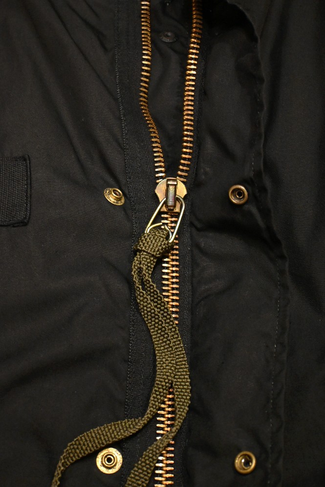デッドストックのM65パーカーをブラックに後染めし、こちらもデッドストックのキルティングライナーをセットにしました。